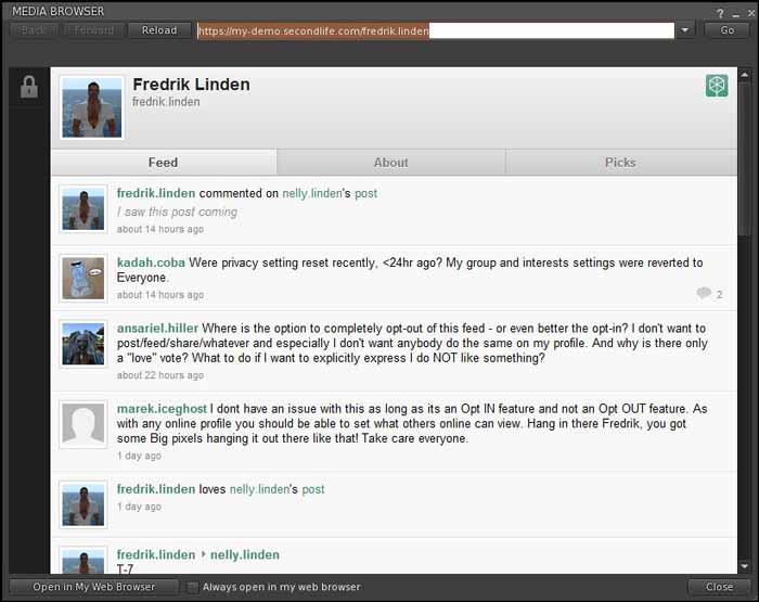 Web-Profile Published 2011/07/15 at 700 × 555 in New Second Life Web Profiles on Demo Next → Demo Second Life Twitter-like Feed in Profile – Click to Enlarge