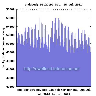 median_conc_by_dayJuly Published 2011/07/16 at 400 × 400 in Second Life and OpenSim Stats ← Previous Next → Concurrency – by Dwell On It
