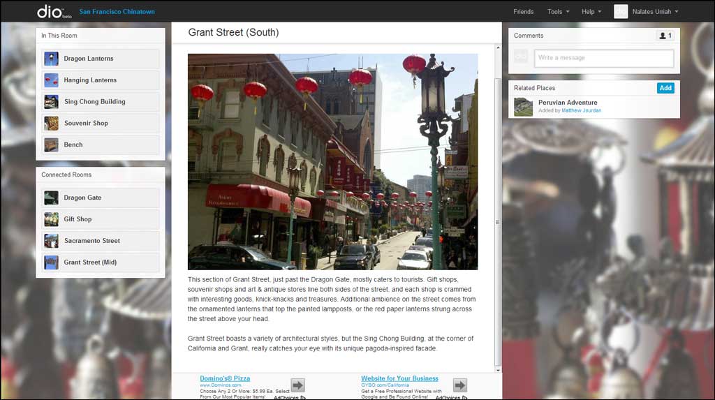 The image shows my screen when I went inside a room. The text items to the left of the main picture are the connected or related links. The image in the center is what is being shared (the room), Grant Street in San Francisco, California. To the right I can add comments and related places.