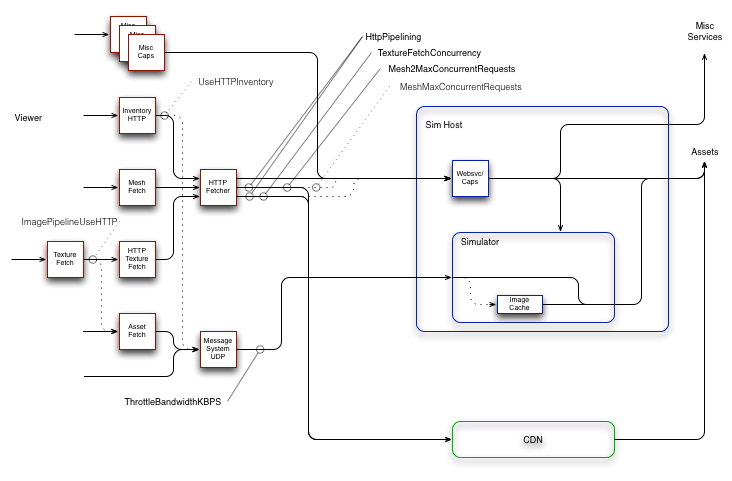 Ball-and-stick objects between a communication path and a text label indicate a viewer debug setting and the communication path or paths that setting influences.  These, too, are in solid and dashed flavors.  The latter indicating obsolescence.  And as always, at least one error crept into my diagram.  In this case, the ‘HttpPipelining’ setting only influences mesh and texture communications.  Inventory is currently unaffected by this setting.  [Image has been corrected – ed]